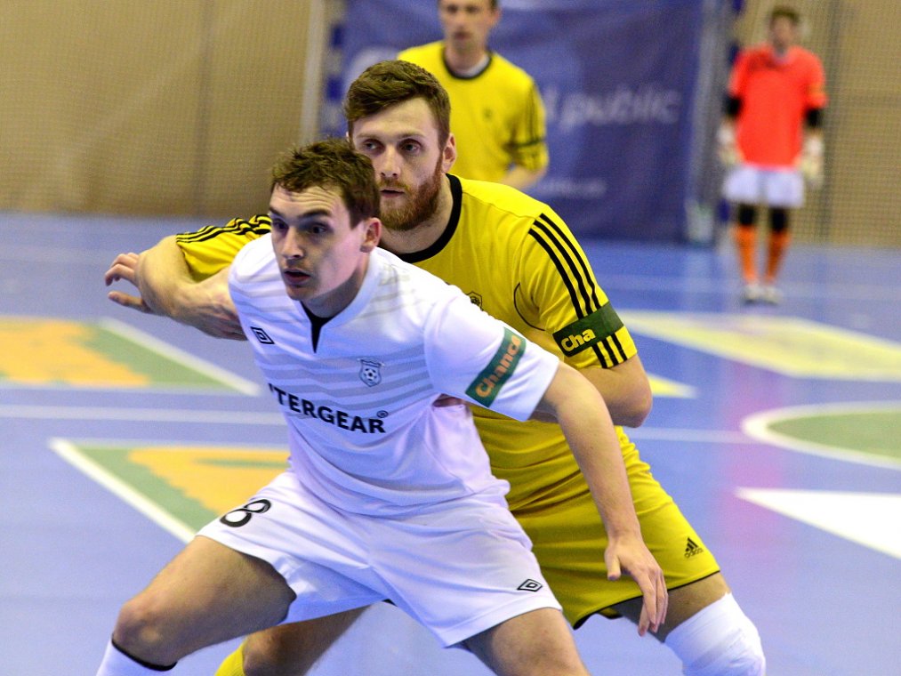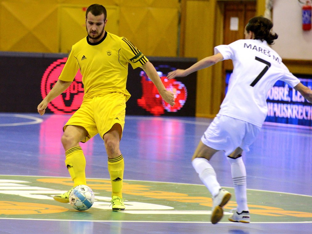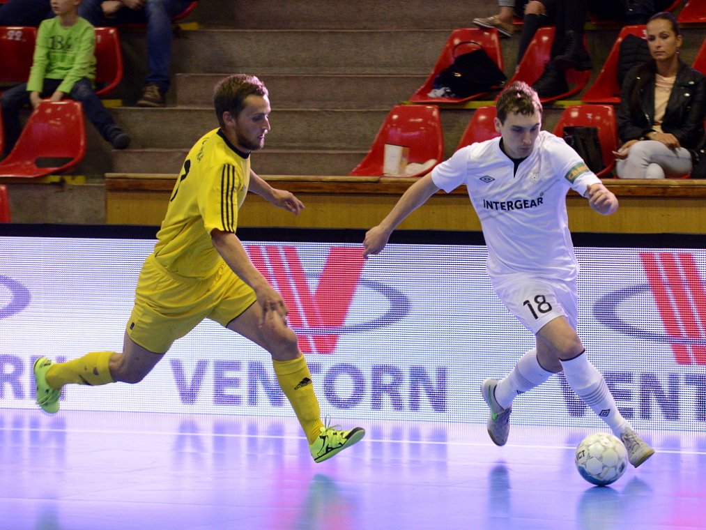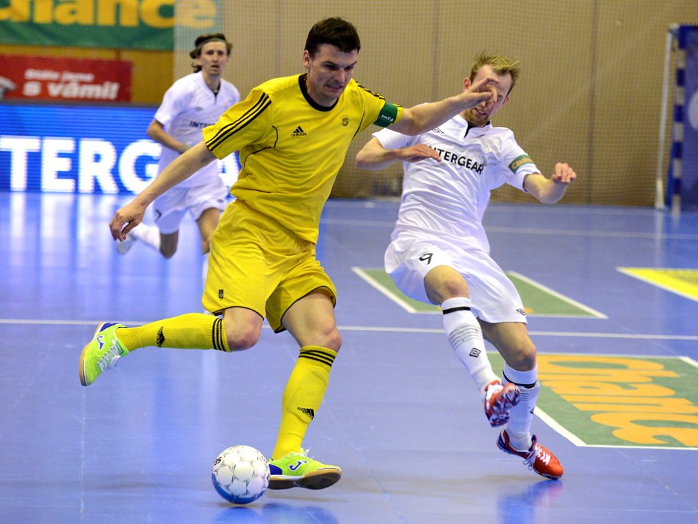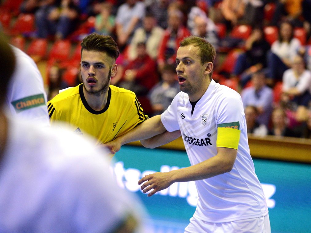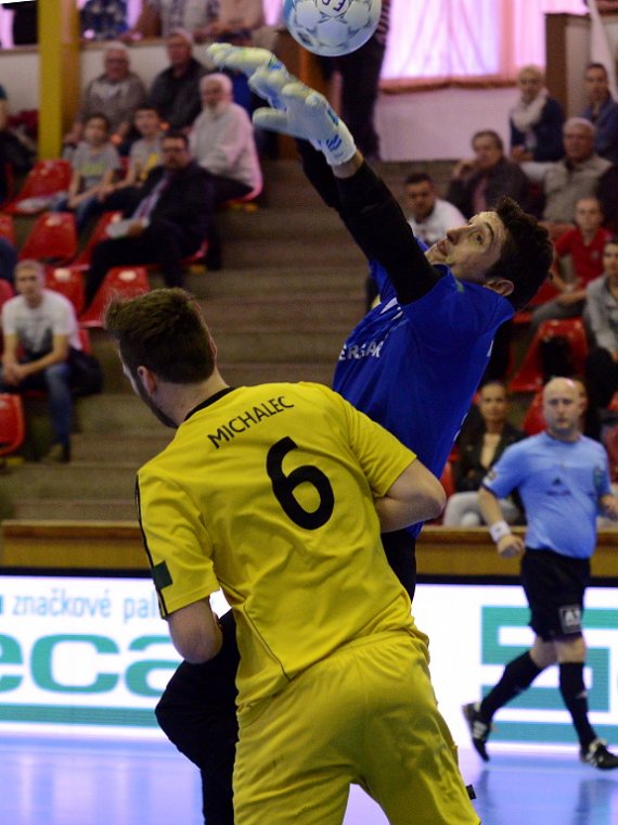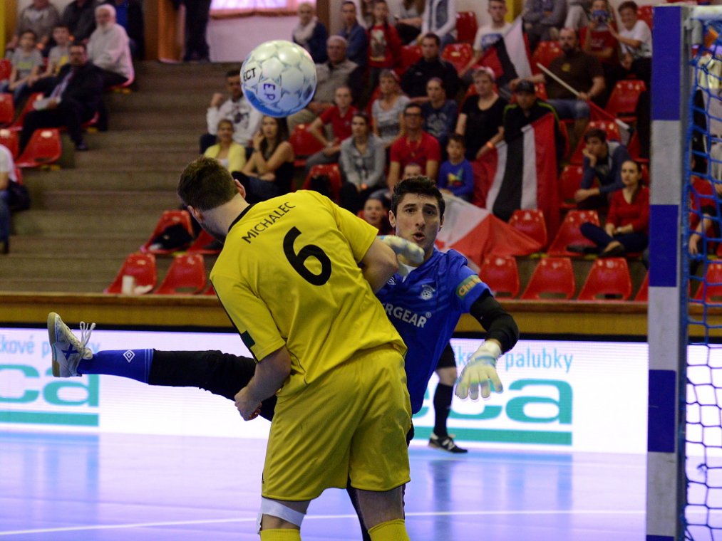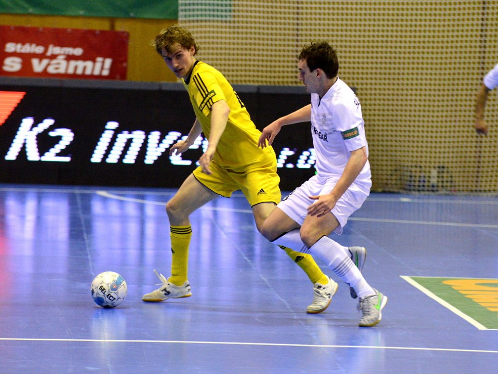 Od začátku se hrál vyrovnaný futsal. Nejzbach pozorně bránil a chodil do nebezpečných brejků. Hosté také těžili ze skvělých zákroků Libora Gerčáka. Šance se rodily na obou stranách, ale první gól vstřelil ve 13. minutě Koudelka, který si počíhal na zadní tyči. Nejzbach odpověděl v 15. minutě po rozehraném rohovém kopu na Vágnera a ten propálil vše před sebou – 1:1. Nadějný výsledek Nejzbach do přestávky neudržel, když v poslední minutě první půle napřáhl Záruba a jeho dělovka skončila za zády Gerčáka – 2:1.